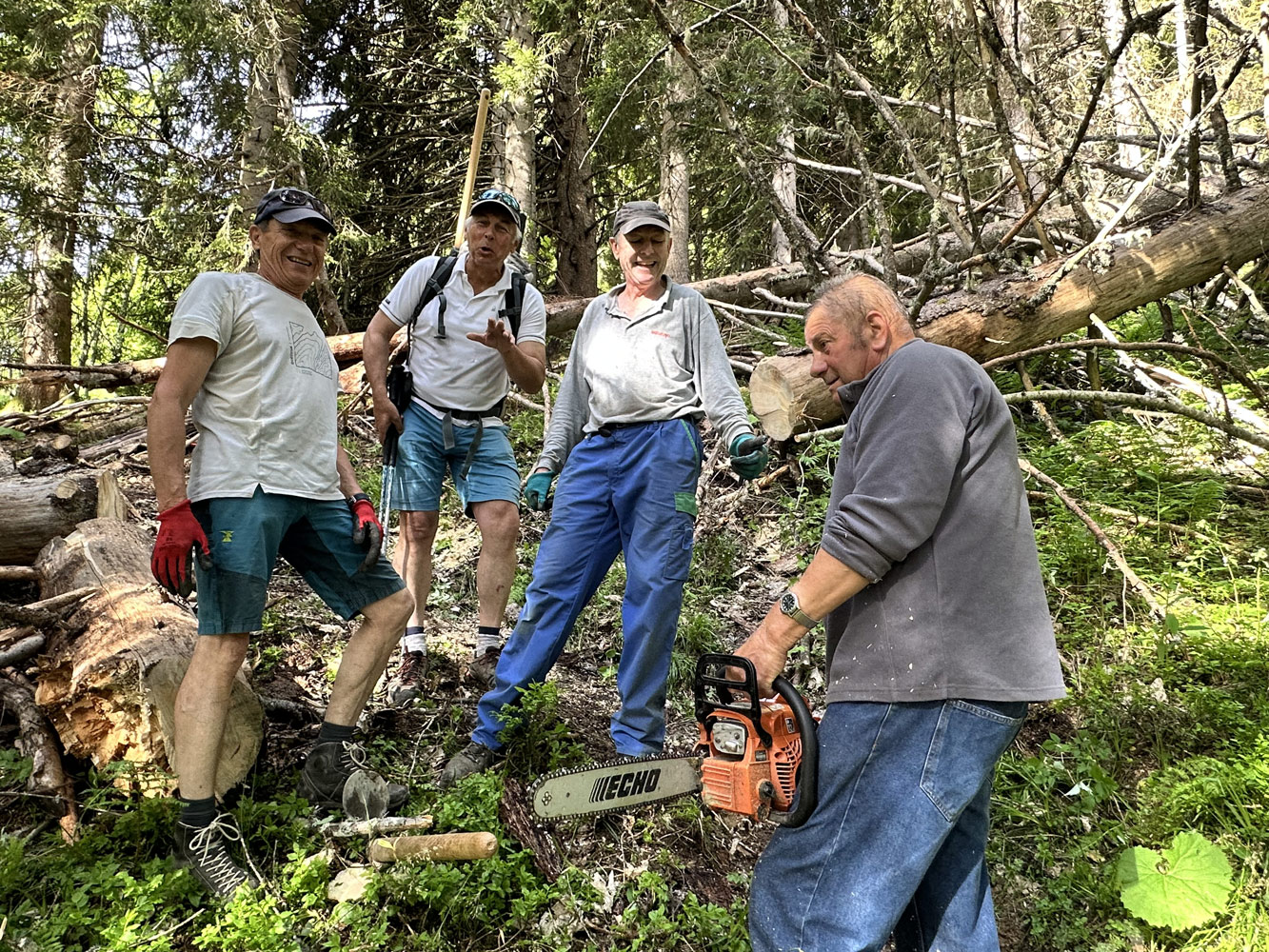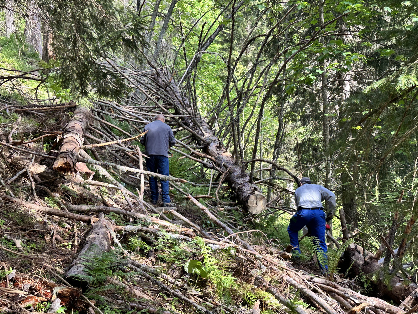 Nous entretenons principalement les sentiers non carrossables, qu'ils soient proches des habitations ou en moyenne montagne. Cela se fait généralement d'avril à octobre, selon les besoins : chutes d'arbres, gués endommagés, renvois d'eau bouchés, itinéraires embroussaillé, cairns détruits, restauration de passages délicats …